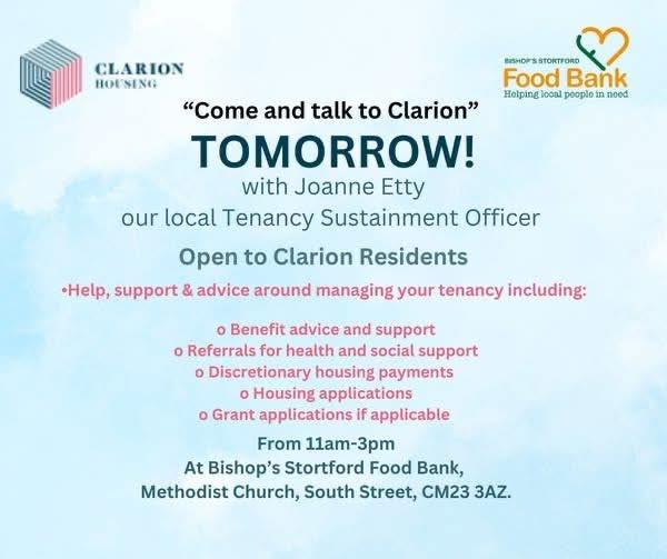 Are you a Clarion tenant and would like to speak to them in person? We have a Clarion drop-in tomorrow Tuesday 6th May 2025 between 11am- 3pm for you to come along and have a chat. (fb)