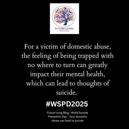 Our latest blog is now available! To mark World Suicide Prevention Day 2025, we have written a blog about how domestic abuse can lead to suicide. Find out more about what can be done to help prevent suicide and potential signs to look out for. https://www.futurelivinghertford.co.uk/world-suicide-prevention-day-how-domestic-abuse-can-lead-to-suicide/ You are not alone - if you are struggling with thoughts of suicide, call the Samaritans on 116 123. #FutureLivingHertford #WSPD2025 #Suicideprevention #suicideawareness #youarenotalone #domesticabuse (fb)