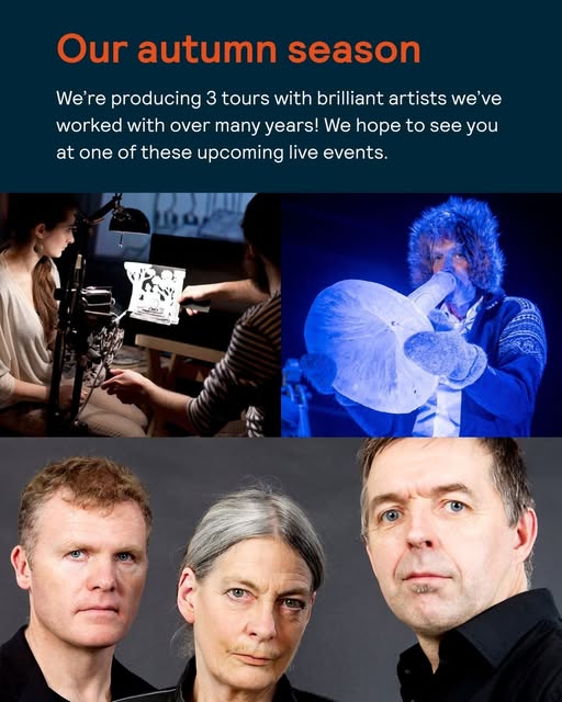 This autumn we’re producing 3 tours with brilliant artists we’ve worked with over many years! We hope to see you at one of these upcoming live shows. Visit our website for full details and booking links:�https://www.sounduk.net/events/ The Paper Cinema: 3 Oct - 4 Nov Imaginative storytellers who create extraordinary, magical worlds with vivid pen and ink drawings, puppetry, and a treasure trove of acoustic and electronic sounds. Quercus: 19 Oct - 28 Nov June Tabor, Iain Ballamy and Huw Warren create chamber music that weaves together the essence of folk and jazz. Terje Isungset Ice Quartet: 16 - 23 Nov Prepare to be transported by the extraordinary, beautiful and ethereal sounds of ice as Terje Isungset, the ice music pioneer, returns to the UK with his exquisite quartet featuring voice, ice harp, ice horn, iceophone, ice percussion and ice bass. (fb)