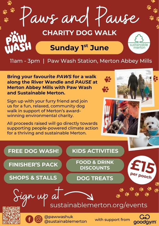 🐾 Calling all dog lovers in Merton! 🐾 Join Sustainable Merton and Paw Wash for our first-ever ‘Paws and Pause’ charity dog walk on Sunday 1st June! 🕚 11AM–3PM | 📍 Merton Abbey Mills | 🎟 £15 per pooch ✨ FREE dog wash 🫧 ✨ Kids activities 🧒🏾 ✨ Shops & stalls 🛍️ ✨ Food & drink discounts ☕🥪 ✨ GoodGym Shoe Drop 👟 Bring your furry friend and walk for a cause! 🐕🌍 💚 SIGN UP HERE: sustainablemerton.org/events-1/paws-and-pause-dog-walk-fundraiser-for-sustainable-merton (fb)