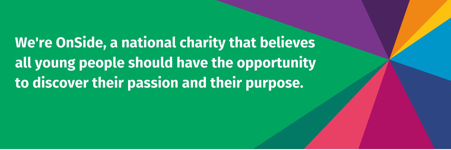 Here for young people We039re OnSide a national youth charity that believes all young people should have the opportunity to discover their passion and their purpose. Our mission is to empower young people to lead positive fulfilling lives by providing access to incredible spaces and exceptional youth work delivered by outstanding people where they are needed the most. To achieve this we raise the funds to build a national network of stateoftheart multimillionpound Youth Zones in the UKs most economically disadvantaged areas. These youth centres we call Youth Zones are staffed by skilled and dedicated youth workers who truly believe in young people helping them see what they could achieve and giving them the skills confidence and ambition to go for it.