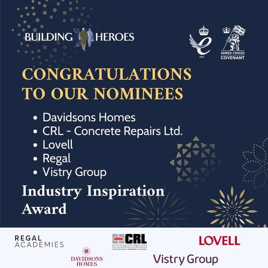 🌟 Category Spotlight 🌟 We’re excited to share the next category in the Building Heroes Community, Impact and Collaboration Awards 2025: Industry Inspiration Award. This award recognises those who inspire others through their leadership, innovation, and unwavering commitment to supporting service leavers, veterans and their families within the construction industry. Congratulations to Davidsons Homes, Concrete Repairs Limited - CRL, Lovell Partnerships Ltd, Regal and Vistry Group. #BuildingHeroes #Awards2025 #IndustryInspiration #CommunityImpact #FundraisingGala (fb)