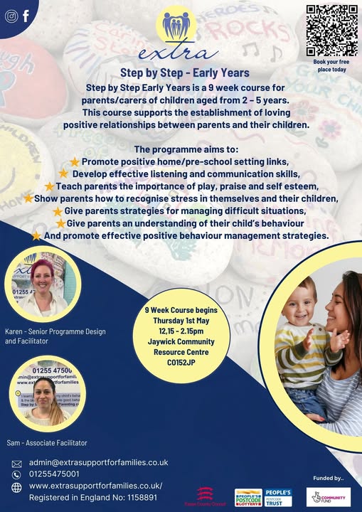 Step by Step Early Years is a FREE 9 week course for parents/carers of children aged from 2 – 5 years. This course supports the establishment of loving positive relationships between parents and their children. The course runs weekly from Thursday 1st May – Thursday 3rd July with a week break for May half term. The sessions run from 12.15pm – 2.15pm each week at Jaywick Community Resource Centre, refreshments provided. The programme aims to: - Promote positive home/pre-school setting links, - Develop effective listening and communication skills, - Teach parents the importance of play, praise and self esteem, - Show parents how to recognise stress in themselves and their children, - Give parents strategies for managing difficult situations - Give parents an understanding of their child’s behaviour - And promote effective positive behaviour management strategies. Please note that this course is also suitable for any parents who may think their child has any additional needs but is too young currently to go into the referral process. Anyone who would like to sign up to the course can register for a free place here - https://www.surveymonkey.com/r/ExtraSummer25 (fb)