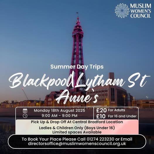 💚 Join Muslim Women’s Council for another unforgettable summer day at the seaside. On Monday 18th August 2025, we’re returning to Blackpool & Lytham St Anne’s after last year’s memorable trip. Enjoy the promenade, freshly baked doughnuts, classic fish & chips, or simply relax on the beach with friends and family. 💷 Adults £20 | Children (16 & under) £10. Price includes coach travel from Bradford, departing Manningham Library at 9am and returning from Blackpool at 7pm. Open to women and girls, as well as boys up to age 16. Limited spaces available on a first come, first served basis. 📞 Call 01274 223230 or 📧 email directorsoffice@muslimwomenscouncil.org.uk to book. #MWCBradford #BlackpoolTrip #CommunityDayOut #MuslimWomensCouncil (fb)