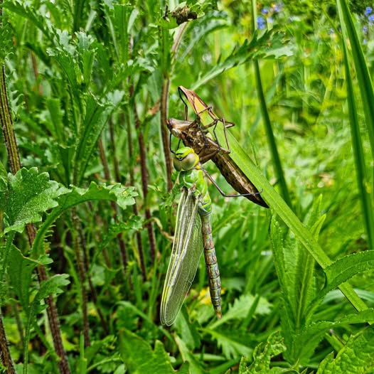 We're so excited to see dragonflies emerging at the pond at Winton Recreation Ground 😀 Dragonfly nymphs typically live underwater for 1–2 years before emerging onto a leaf ready to shed their outer casing. That's what you can see has just happened in this photo. Once out, they wait an hour or so until their wings harden and they can fly. We think this is an emperor dragonfly. There are more empty casings around the pond from dragonflies which have emerged. If you're visiting Winton Recreation Ground, have a look and see if you can spot any dragonflies flying around the pond. (fb)