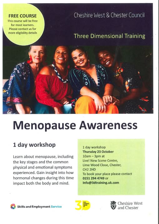 ✨ FREE WORKSHOP THIS THURSDAY AT LIVE! ✨ 🕙 10:00 AM – 3:00 PM Join us for an informative and supportive session on menopause. Discover the key stages, explore common physical and emotional symptoms, and gain a deeper understanding of the hormonal changes that affect both body and mind during this transition. Call 0151 294 4749 or email info@3Dtraining.uk.com #EmpoweringPeopleWithDisabilities #OptimisingOpportunities #ThriveAtLive (fb)