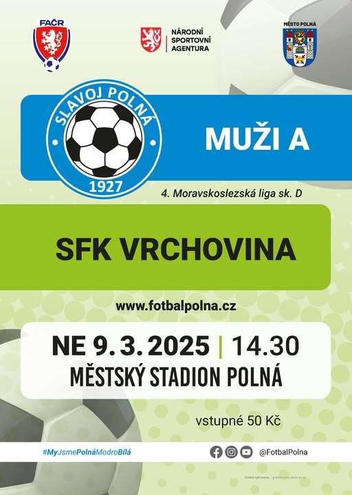 📢 POZVÁNKA NA PRVNÍ JARNÍ UTKÁNÍ! ⚽🔥 Fanoušci Slavoje, je to tady! Po dlouhé zimní pauze se vracíme na hřiště a čeká nás první jarní zápas. 💪 🆚 Slavoj Polná 🆚 SFK Vrchovina 📅 Neděle 9. března ⏰ 14:30 🏟 Domácí stadion, Polná Přijďte nás podpořit a vytvořit skvělou atmosféru! Společně zabojujeme o důležité body! 💙⚽ #SlavojPolná #JarníStart #BojujemeZaPolnou #Fotbal #DomácíZápas (fb)