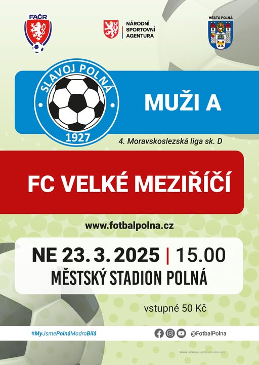 🔵⚪ POJĎME ZA SLAVOJEM! DOMÁCÍ ZÁPAS PROTI VELKÉMU MEZIŘÍČÍ! ⚽ Už tuto neděli 23. 3. od 15:00 nás čeká důležitý domácí duel na Městském stadioně v Polné! 💥 Přivítáme soupeře z FC Velké Meziříčí a hraje se o hodně – stále živíme naději na záchranu a chceme se odpoutat ze dna tabulky. Každý bod, každý zápas a hlavně každý hlas z hlediště může rozhodnout! 🙌 Přijďte nás podpořit a vytvořit pravou domácí atmosféru! 💙⚪ Vaše podpora = naše síla. #SpoluZaSlavoj 📍 Kdy: Neděle 23. března 🕒 Čas: 15:00 🏟️ Kde: Městský stadion Polná (fb)