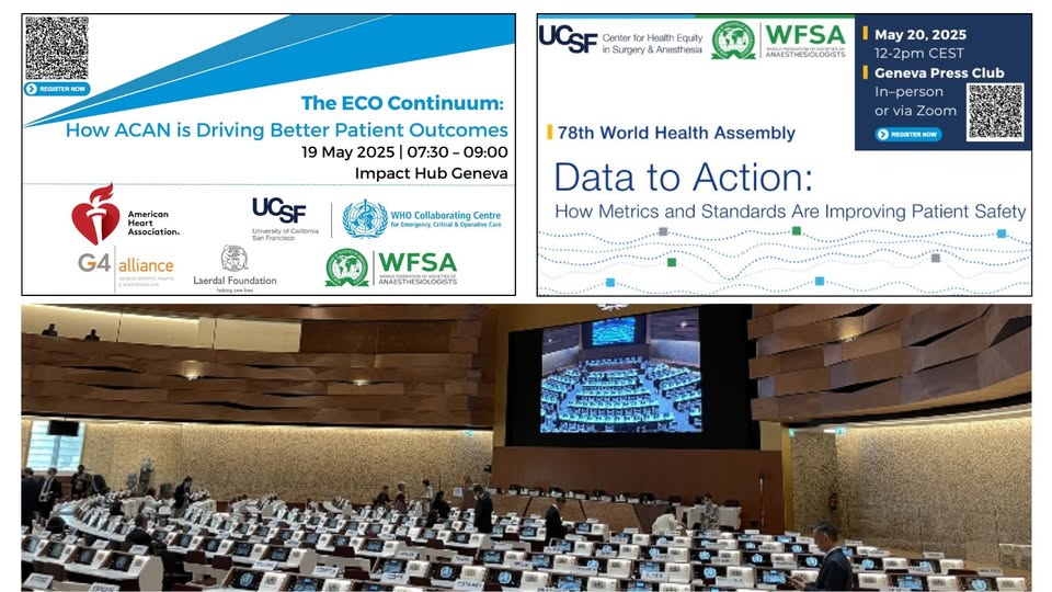 🌍 WFSA at WHA78: Championing Anaesthesiology on the Global Stage The WFSA will attend the 78th World Health Assembly (19–27 May) to advocate for anaesthesiology’s vital role in building resilient, equitable, and sustainable health systems. We’re also co-hosting two impactful side-events in Geneva: 🔹 The ECO Continuum: How ACAN is Driving Better Patient Outcomes 📅 19 May | ⏰ 07:30–09:00 | 📍 Impact Hub Geneva 🔗 Register here: https://ow.ly/9PZj50VBt1C 🔹 Data to Action: How Metrics and Standards are Improving Patient Safety 📅 20 May | ⏰ 12:00–14:00 | 📍 Geneva Press Club 🔗 Register here: ow.ly/sU1X50VFyb6 Join us in person or online as we drive global change in patient safety and perioperative care. #WHA78 #GlobalHealth #Anaesthesiology #PatientSafety #HealthSystems #DataForHealth (fb)