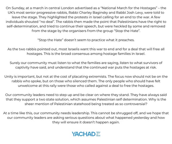 Our statement on Sunday's march. In solidarity with The Chief Executive Rabbis of Progressive Judaism. https://yachad.org.uk/statement-on-progressive-rabbis-at-national-march-for-hostages/ (fb)