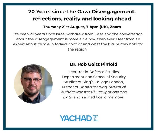 Join us on Thursday 21st August at 7pm, on Zoom, for expert insights from Dr Rob Geist Pinfold on Israel's Gaza disengagement in 2005, including discussion on misconceptions around the issue, and the Israeli government's current plans in Gaza and the West Bank. Register at www.yachad.org.uk/events (fb)