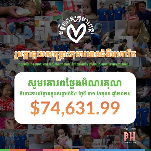 #យុទ្ធនាការរួមគ្នាជួយសង្រ្គោះកុមារមានជំងឺមហារីក ✨ ក្នុងរយៈពេល ៤ សប្ដាហ៍កន្លងមកនេះ មន្ទីរពេទ្យកុមារអង្គរ បានបង្កើតយុទ្ធនាការ “#រួមគ្នាជួយសង្រ្គោះកុមារមានជំងឺមហារីក ” ក្នុងគោលបំណង ដើម្បីលើកកម្ពស់ការយល់ដឹង និងសេវាព្យាបាលជំងឺមហារីកលើកុមារ និងដើម្បីរៃអង្គាសថវិកា សម្រាប់ប្រតិបត្តិការណ៍លើផ្នែកមហារីករបស់មន្ទីរពេទ្យកុមារអង្គរផ្ទាល់។ ✨ តាមរយៈការឧបត្ថម្ភគាំទ្រពី Peng Huoth Group Dj NanaTips SAI សប្បុរសជន ក្រុមហ៊ុន អាជីវកម្ម ស្ថាប័ននានា ទាំងក្នុងនិងក្រៅប្រទេស មន្ទីរពេទ្យកុមារអង្គរមានសេចក្តីសោមនស្សរីករាយ ប្រកាសនូវចំនួនថវិកាសរុបដែលប្រមូលបាននៅក្នុងសប្តាហ៍ទី៤នេះ គឺមានចំនួនសរុប 74,631.99 ដុល្លារ។ 💚 សូមជួយមន្ទីរពេទ្យកុមារអង្គរជាបន្តទៀតតាមរយៈការបរិច្ចាគមិនថាតិចក្តី ច្រើនក្តីដើម្បីកុមារដែលកំពុងសម្រាកព្យាបាលនៅក្នុងមន្ទីរពេទ្យកុមារអង្គរទាំងអស់។ សូមជួយខមិន (comment) ការបរិច្ចាគរបស់បងប្អូនខាងក្រោម ដើម្បីឱ្យមន្ទីរពេទ្យ ថ្លែងអំណរគុណបងប្អូន និងសូមចុច (mention) បន្តទៅមិត្តភក្តិរបស់អ្នកដើម្បីចែករំលែកកិច្ចការងារមនុស្សធម៌! __________ 🙏សូមជួយមន្ទីរពេទ្យកុមារអង្គរ ដើម្បីឱ្យយើងអាចបន្តផ្តល់ការថែទាំសុខភាពដល់កុមារតាមរយៈការបរិច្ចាគ៖ 1. ស្កេនឃ្យូអរកូដ (KHQRs) 2. បរិច្ចាគតាមរយៈតំណរភ្ជាប់នៅក្នុងខមិន (comment) 3. ទំនាក់ទំនង៖ 017 725 745 / 098 725 745 ឬ ahc@angkorhospital.org #AHC #មន្ទីរពេទ្យកុមារអង្គរ #Cancer #TogetherAgainstChildhoodCancer #រួមគ្នាជួយសង្គ្រោះកុមារមានជំងឺមហារីក (fb)