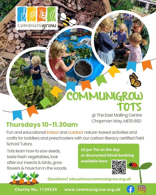 The fantastic Communigrow Tots sessions are back! 🎉 Fun and educational indoor and outdoor nature-based activities and crafts for toddlers and preschoolers with our carbon literacy certified Field School Tutors 💚 Tots learn how to sow seeds, taste fresh vegetables, look after our insects & birds, grow flowers & have fun in the woods 🥕🐝🐞🌷 Thursdays 10-11.30am with Communigrow at The East Malling Centre. No need to book, just pay on the day - £6 per tot. Communigrow.org.uk For more information email education@communigrow.org.uk #westmalling #eastmalling #snodland #ditton #aylesford #offham #wateringbury #leybourne #larkfield #kinghill #ryarsh #rochester #maidstone #allington #sevenoaks #tonbridge #kent #medway (fb)