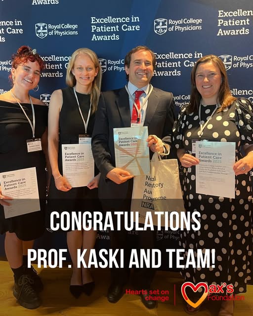 We are so proud to share that our ambassador, Prof. Juan Pablo Kaski and his team (including our research nurse and assistant, Ella Field and Annabelle Barnes) have won the RCP Excellence in Patient Care Award for Research. Their work embedding research into a clinical service to improve outcomes for children with heart conditions has been vitally important at GOSH, and we are honoured to support their team with our ongoing fundraising. Prof. Kaski said: “It is a real honour to receive the Royal College of Physicians Excellence in Patient Care Award for Research. Embedding research within our clinical service means that our work has our patients and their families at its heart and that the findings of our research can be quickly translated into clinical practice to improve patient care. Our team’s work has led to new discoveries and developments that have already had a positive impact on the care and outcomes of children with inherited cardiac conditions. The award is a recognition for the hard work and exceptional dedication of our amazing team. None of this would have been possible, though, without the incredibly generous support and funding from Max’s Foundation, for which we are truly grateful.” Well done team! (fb)