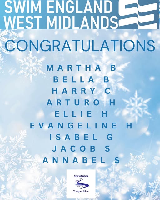 Congratulations to our swimmers who have qualified for the Short Course Winter Regional Championships. This is particularly impressive, as there are only Junior (15 and under) and Senior categories. They will be up against the best of the best of the West Midlands. The championship takes place at Sandwell Aquatics Centre on 1st and 2nd November. (fb)