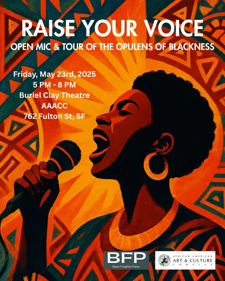 What’s an Open Mic? It’s your moment to shine. Speak your truth. Share your art. Feel the vibe. 🔥 No pressure. All love. 🔥 Music, poetry, rap, comedy, storytelling. If you’ve got something to say, the mic is yours. And tonight, it’s more than a mic. It’s a celebration of Black brilliance with a live tour of “The OpuLENS of Blackness” exhibit. Show up. Speak up. Light it up. Presented by : @blackfreighterpress & @aaaculturecomplex #RaiseYourVoiceSF #openmicmagic #opulensofblackness #speakyourtruth #bayareaevents #aaacc #LiveArtLiveVoices #sfevents #blackartists #blackartistsmatter #raiseyourvoice #openmic #openmicpoetry #openmicnight (fb)