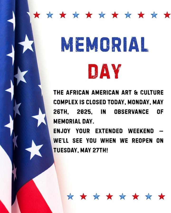 The African American Art & Culture Complex is closed today, Monday, May 26th, 2025, in observance of Memorial Day. Enjoy your extended weekend — we’ll see you when we reopen tomorrow (Tuesday, May 27th!) (fb)