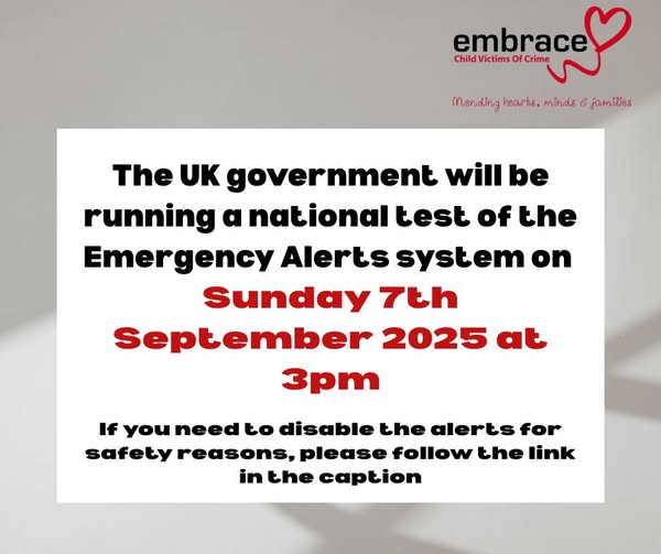 UK emergency alert test: 7th September On Sunday 7th September at 3pm, a UK-wide emergency alert test will take place. Mobile phones will make a loud siren-like sound, even if they are on silent. They may also vibrate. Whilst these alerts aim to protect the public in emergencies, they could put victim-survivors of domestic abuse at risk, especially those who rely on hidden phones as part of their safety plan. For information on how to opt out, please visit: https://www.gov.uk/alerts/opting-out (fb)