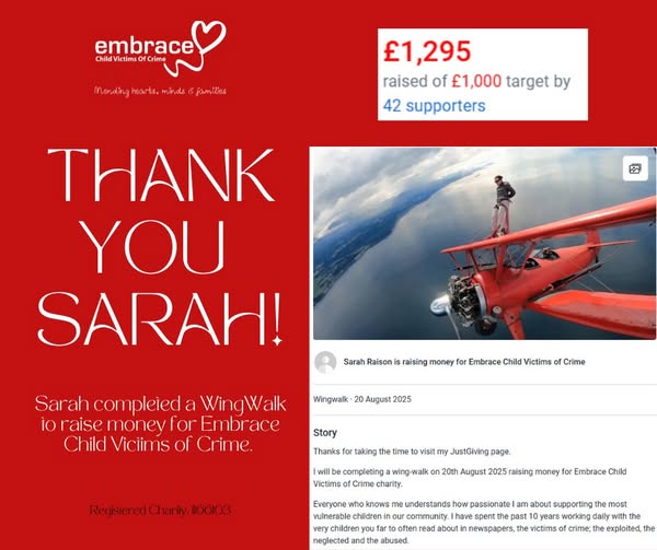 Thank You Sarah! Sarah took on the incredible challenge of completing a WingWalk to raise money for Embrace Child Victims of Crime! Sarah raised a total of £1295 to support children and families that have been devastated by serious crime. We are incredibly grateful for Sarah's determination and support, not to forget thank you to all of her supporters! #EmbraceCVoC #TraumaInformed #Support #Fundraising #LifeChangingChallenges (fb)