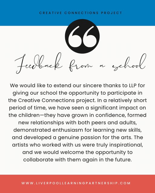 Creative Connections was a project, funded by @merseysidevrp , where children at risk of persistent absenteeism were given the opportunity to work with an artist or arts organisation over a period of four months. We are in the process of evaluating and pulling together all of the data and feedback from the project at the moment but what's really standing out to us is the impact it's had on the children's wellbeing and confidence. We've had several case studies sent of children who at the beginning of the project wouldn't engage with the artist or the other children in the group but by the end were mixing comfortably with their peers and children of different ages. The change in one child was described as a "remarkable transformation." Arts activity has allowed those children to make connections with the adults they have been working with and the other children in the group. Working with the artists- @artsgroupie , @tinaramosekongoart, @fbebbington and @makemouthmusic- has had an incredible impact on those children. (fb)
