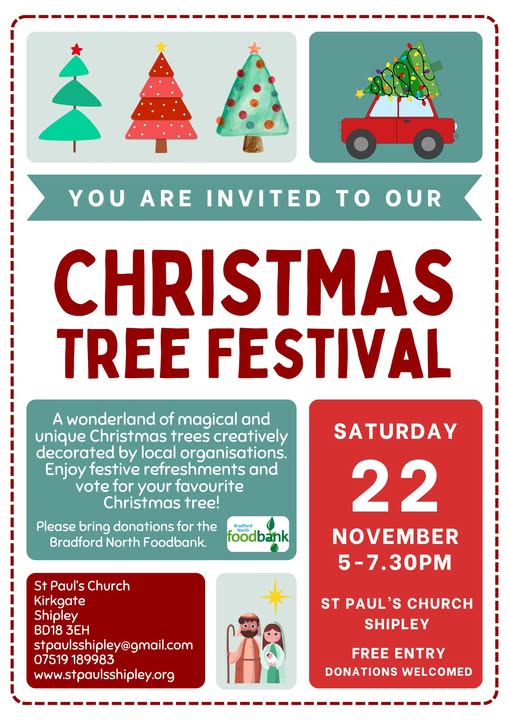 Not long to go now until our annual Christmas Tree Festival!!! We have 28 fantastic local organisations signed up to take part and a couple of spaces left for any that would still like to enter. Email: stpaulsshipley@gmail.com to take part. Please share!🎄🎄🎄 (fb)
