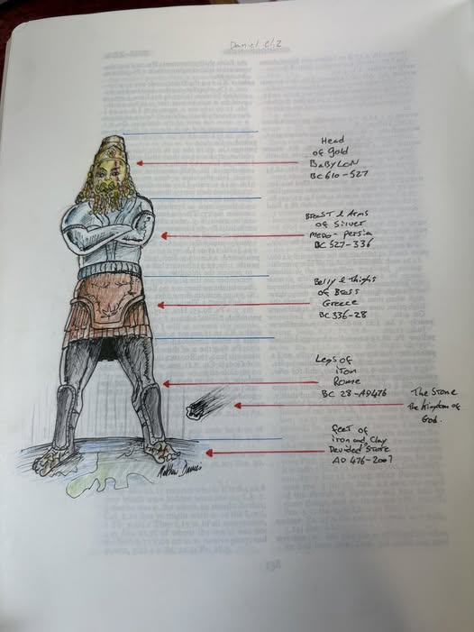Whilst adding a Bible to our Second hand catalogue I noticed this lovely hand drawn diagram of Nebuchadnezzar's Image (See Daniel Chapter 2) in the back. (fb)