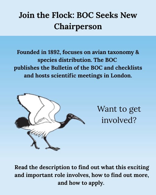 Call for Candidates for the Chairperson of the British Ornithologists’ Club! The British Ornithologists’ Club would like to hear from anyone interested in applying for the position of Club Chairperson. The BOC (https://boc-online.org/) was founded in 1892 and is devoted to the study of avian systematics and species distribution, worldwide. It promotes the importance of avian taxonomy, both as an end in itself and as baseline information to drive efforts in avian science, conservation, and the promotion of biodiversity. It holds quarterly scientific meetings in central London, comprising talks followed by social suppers, sometimes in collaboration with the Linnean Society of London. It publishes the Bulletin of the BOC online and a series of regional checklists as well as other occasional publications. It is a registered charity. The Club is seeking a new Chairperson to join the established team of Trustees from January 2026. The role is fully supported by the Club Secretary, Treasurer, Bulletin Editor, Meetings Secretary, Social Media Manager, Webmaster, and Mailing List Manager. The principal tasks include: organising and chairing Trustee meetings; working with the Trustees to further the aims and work of the club; developing financial strategy and reporting in collaboration with the Club Treasurer; preparing the Club’s Annual Report; liaison with the Charities Commission and other collaborating institutions; oversight of the Bulletin Editor; and contract negotiation with the authors and publishers of the Club’s publications, supported by the Club Secretary. There is no stipend for the post, but legitimate expenses will be covered. Interested parties should contact the Honorary Secretary, Andrew Richford, at andysrichford@gmail.com, in the first instance. (fb)