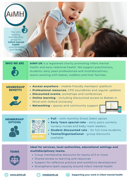 💛 Are you working with babies, toddlers or families? Join the AiMH UK community and get exclusive member benefits that support your practice in infant mental health. 🔓 Membership unlocks many benefits including discounted tickets to the online AiMH UK National Conference Nov25; Tiny Senses, Big Impact — our biggest annual gathering for learning, connection and inspiration - https://AiMHUKNationalConference2025-TinySensesBigImpact.eventbrite.co.uk 👥 Perfect for practitioners, early years professionals, students and teams in multidisciplinary services, local authorities and educational settings, especially those looking to save on group bookings and access shared learning. 🌐 Learn more or join today: aimh.uk/membership #InfantMentalHealth #EarlyYears #CPD #NationalConference #WorkforceDevelopment #AiMHUK (fb)