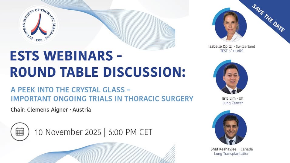 🔮 ESTS Webinar: A Peek into the Crystal Glass – Important Ongoing Trials in Thoracic Surgery The European Society of Thoracic Surgeons (ESTS) is delighted to invite you to a thought-provoking webinar highlighting key ongoing trials shaping the future of thoracic surgery. 🗓 Date: 10 November 2025 ⏰ Time: 6:00 PM CET Chair: Clemens Aigner (Austria) Speakers: • Isabelle Opitz (Switzerland) – TEST 5´+ LVRS • Eric Lim (UK) – Lung Cancer • Shaf Keshavjee (Canada) – Lung Transplantation 👉 click here https://shorturl.at/Xrb7S (fb)
