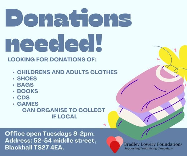 Donations needed!! If your able to donate any of the below items we would be so incredibly grateful. Clothes Shoes Bags Books DVD's Cd's Games Toys Our office will be open tomorrow from 9am - 2pm and our address is 52-54 middle street, Blackhall TS27 4EA ❤ (fb)