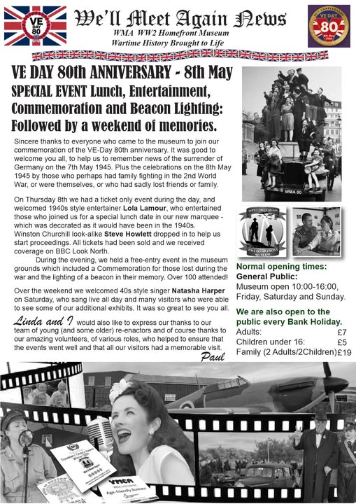 Well Meet Again WW2 Homefront Museum Wartime History Brought to Life VE Day 80th Commemoration VE Day lunch entertainment and museum access. Special Event on the 8th May 2025 VE Day 1945 2025 80th Anniversary Singing live will 1940s style entertainer Lola Lamour. You can enjoy a buffet lunch in the marquee from 12 noon Gain full access to the museum between 10am and 2pm Ticket holders only . please see poster below for details.
