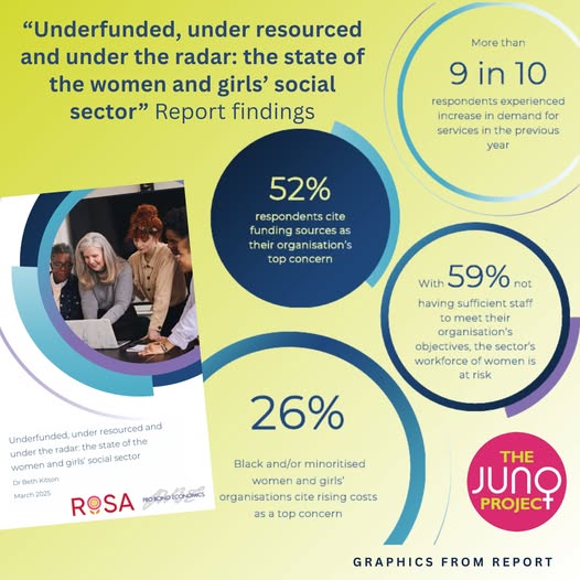 📣 We were proud to take part in a recent survey led by Rosa – a leading UK-wide funder of the women and girls’ sector. The survey, conducted by Pro Bono Economics, aimed to better understand the challenges, operations, and ambitions of charities working to support women and girls across the UK. The findings have now been published in a powerful new report. 📊 💡 Did you know? 👩🦰 Women and girls’ charities account for only 3.5% of all registered charities 📈 91% of organisations reported a surge in demand for their services in the past year 🔮 93% expect demand to continue growing 💷 52% identified funding sources as their top concern ⚠️ 44% said they may struggle to meet future demand This report shines a light on both the incredible impact of these organisations and the urgent need for better support and sustainable funding. 📖 Read the full report here: https://bit.ly/RosaReportJuno #RosaUK #SocialImpact #FundingTheFuture #TheJunoProject #Charity (fb)