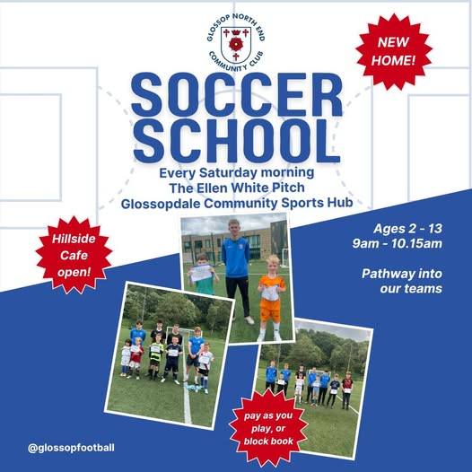 🚨 Soccer School ⚽️ Our Soccer School returns tomorrow to Glossop North End Community Club on the Ellen White Pitch 🙌 🕘 9:00–10:15am (ages 2–13) 🏅 Presentations until 10:30am 📍 SK13 7QG 🔹 Age groups: 👶 2–4: Soccer Starters 🧒 5–7: Foundations 🧑🦱 8–10: Development 👦 11–13: Performance Prep 💷 Just £5 per child 🎟 Book online or pay cash on the day 🎁 Free club t-shirt after 6 sessions 🏆 Weekly & monthly prizes ☕️ Hillside Café open! Come down, join the fun, and start your football journey with us! Book online: https://glossop-north-end-community-club.sumupstore.com/product/soccer-school-saturdays (fb)