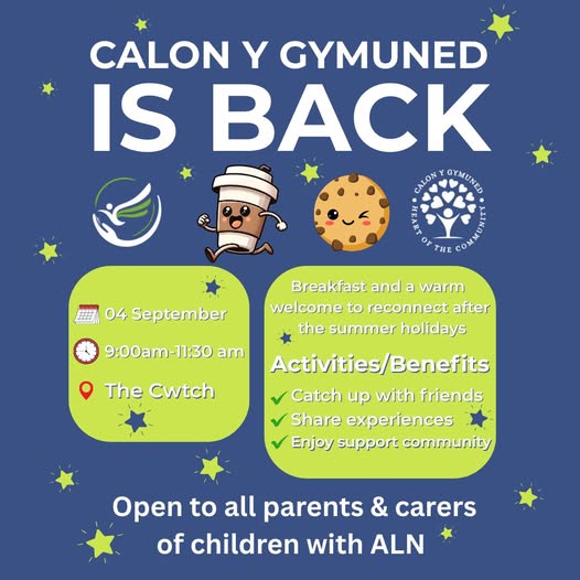 Calon Y Gymuned is back and we're excited to welcome parents and carers this Thursday at The Cwtch Craigfelen ❤🫂 Come along and chat with others, whatever your child's needs, there'll be the opportunity to connect and feel a part of a warm community 🫶💚 #aln #LocalCharity #SupportLocalCharities #StrongerTogether #PositiveParenting #Swansea #sensoryregulation #ChildrensCharity #AdenyddUK #community #Wales #FamiliesSupportingFamilies #abertawe #FamilySupport #ParentingSupport #ActNowNotInAMinute #CommunityMatters #StepsForward (fb)