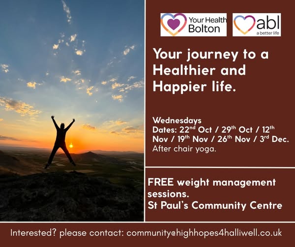 Are you interested in free weight management sessions, if so please contact community@highhopes4halliwell.co.uk. These sessions are designed to make you feel better, move more and regain control of your lifestyle and will be run by a Senior Nutritionist from Your Health Bolton. WHAT WE EXPECT FROM YOU: A commitment to attend the sessions A willingness to make small, achievable changes to your diet and lifestyle. WHAT YOU CAN EXPECT FROM US: A supportive and caring environment Up to date and evidence based information Fun, appropriate activity sessions Practical tips and ongoing encouragement. For further information, contact us at community@hopes4halliwell.co.uk #YourHealthBolton #makinghealtyhappen #ableabetterlife (fb)