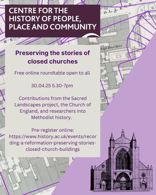 Join our Centre for the History of People, Place & Community for an online roundtable discussion on 30.04.25 (5.30-7pm) about if & how to preserve the histories & stories of church buildings & communities when churches have to close. Everyone is welcome to this free event. Pre-register at https://www.history.ac.uk/events/recording-a-reformation-preserving-stories-closed-church-buildings (fb)