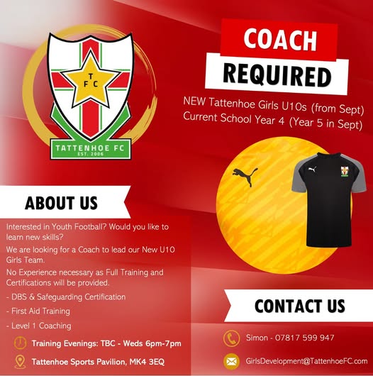 COACH NEEDED!!! Interested in Youth Football? Would you like to learn new skills? Girls football has exploded at Tattenhoe FC, we have over 150 Girls at the club now and we are just about to launch our new U10 team, however they require a coach to take them forward into League Matches from September. Coaching is such a rewarding activity, none of our coaches have regretted it! No Experience necessary as Full Training and Certifications will be provided. - DBS & Safeguarding Certification - First Aid Training - Level 1 Coaching Please get in touch - GirlsDevelopment@TattenhoeFC.com (fb)