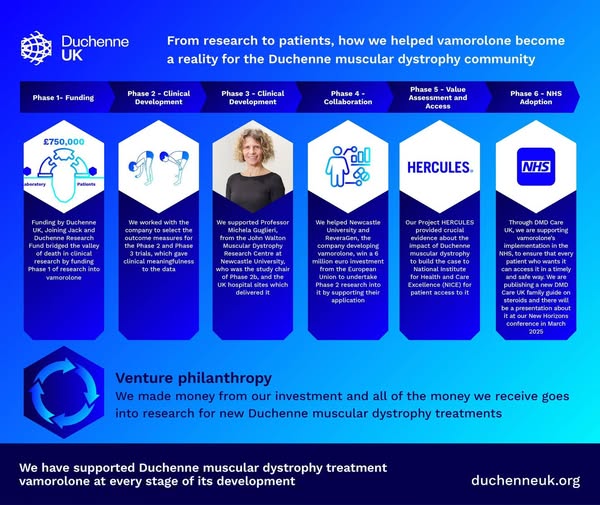 Many of you have donated to us many times before and we are so grateful for all the support we have received over the years. The money you have given really has made a difference! Over the last two years, 2 new drugs to treat DMD have become available. @duchenneuk (using the money raised from the Dash) has been the driving force behind these developments and this has only been possible from the donations it receives. This infographic shows the many stages of the process to get Vamorolone, an alternative to steroids, implemented by the NHS. This is the work that goes on every single day by Duchenne UK to try to improve the lives of those living with Duchenne. While there is still no cure for Duchenne, there is now a drug called Givinostat which has been proven to slow the progression of the disease. Unfortunately, even though this medicine should be available to all, it isn’t yet. Duchenne UK is working around the clock to support families, work with NHS Trusts and lobby MPs so that more boys with Duchenne can access this drug. By feeding into a large and powerful charity, we can ensure that your donations have the biggest impact. And this is why we ride to Paris again in just 3 days. For Connor and boys like him. If you are able to support us again, the link is in the bio. Please look out for updates on how our journey to Paris is going on our socials across the weekend 💙 musculardystrophy #duchenneawareness #connorcrawford #endduchenne #londontoparisin24hours #charity #fundraising #duchennedash #cycling #chasingconnorscure #raredisease #nevergivingup #fightingforacureforms (fb)