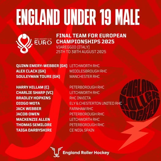 🏴 England U19 Men – Final Squad Announcement 🏴 🏆European Championships – Viareggio, Italy 📅 25–30 August 2025 England Roller Hockey is proud to announce the final squad selected to represent the country at the upcoming European Under 19 Male Championships in Viareggio, Italy. Following a competitive selection process, Head Coach Arran Bowyer has confirmed the following players will travel to Italy to compete against the best of their age in Europe. 🏴 Final Squad: ⭐Alex Clack (GK) - Middlesbrough RHC ⭐Souleyman Toure (GK) - Manchester RHC ⭐Quinn Emery-Webber (GK) - Letchworth RHC ⭐ Harry Hillam (C) – Peterborough RHC ⭐ Charlie Sharp (VC) – Letchworth RHC ⭐ Bradley Hopkins – RHC Invicta ⭐ Diogo Mota – Ely & Chesterton United RHC ⭐ Jack Webber – Farnham RHC ⭐ Thomas Semilore – Peterborough RHC ⭐ Mackenzie Allen – Letchworth RHC ⭐ Taiga Darbyshire – C.E. Noia (Spain) ⭐ Jake Owen – Letchworth RHC This exciting group of players will represent the future of English roller hockey on the European stage, showcasing their talent, teamwork and determination. Let’s get behind the team as they prepare to compete against the best in Europe! (fb)