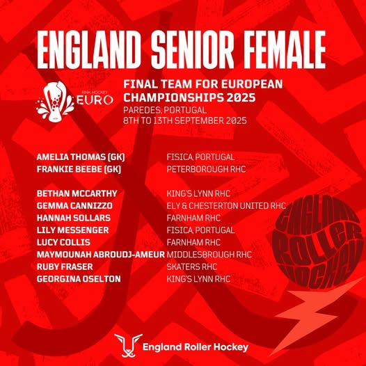 🏴England Senior Female Team Announcement – European Championships 2025 🇵🇹 We are delighted to announce the England Senior Female squad that will represent the nation at the 2025 European Championships in Paredes, Portugal (8th–13th September). This talented group will be led by Head Coach Arran Bowyer, assisted by Carlos Amaral, as they take on Europe’s best this September. 🥅Goalkeepers ⭐Amelia Thomas - Fisica, Portugal ⭐Frankie Beebe – Peterborough RHC 🏑Floor Players ⭐Beth McCarthy – King's Lynn RHC ⭐Gemma Cannizzo – Ely & Chesterton United RHC ⭐Hannah Sollars – Farnham RHC ⭐Lily Messenger - Fisica, Portugal ⭐Lucy Collis – Farnham RHC ⭐Maymounah Abroudj-Ameur – Middlesbrough RHC ⭐Ruby Fraser – Skaters RHC ⭐️Georgina Oselton - Kings Lynn RHC Team Staff Head Coach – Arran Bowyer Assistant Coach – Carlos Amaral Manager – Lucy Rawlinson Assistant Manager – Emma Thomas 👏 Congratulations to all selected players and staff. We wish you the best as you prepare to compete on the European stage. Let's go, England! (fb)