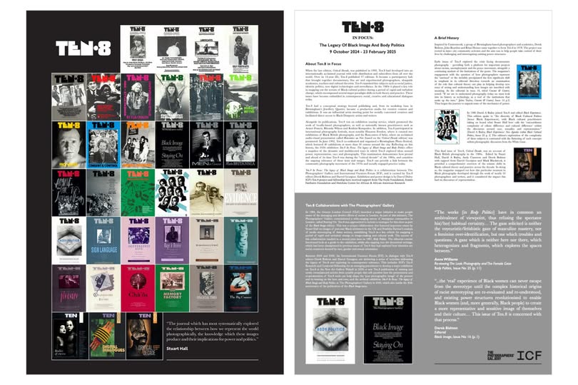 EXHIBITION / Last chance to visit Ten.8 in Focus at The Photographers' Gallery before it closes on 23 February! Ten.8 in Focus: The legacy of Black Image and Body Politics (9 October 2024 - 23 February 2025) celebrates the renowned photography journal Ten.8 and its wider influence. It brings into focus two editions of Ten.8, Black Image (1984) and Body Politics (1987), by activating this rich history through text, design and archival material. Using these two issues as a departure point, this exhibition aims to open up a wider conversation about the legacy of Ten.8 and its exploration of the photographic medium. Read more and book tickets here https://bit.ly/4h7zr7W As Ten.8 in Focus comes to a close, take a piece of the exhibition home with the limited edition Ten.8 poster. Each specially designed A2 poster is signed by ICF's Artistic Director David A Bailey and Ten.8 Editors Derek Bishton and Darryl Georgiou. Posters can be purchased at The Photographers’ Gallery bookshop and online at the ICF Shop. Poster design by Darryl Daley. Order the poster online here https://bit.ly/4e5b1JD (fb)