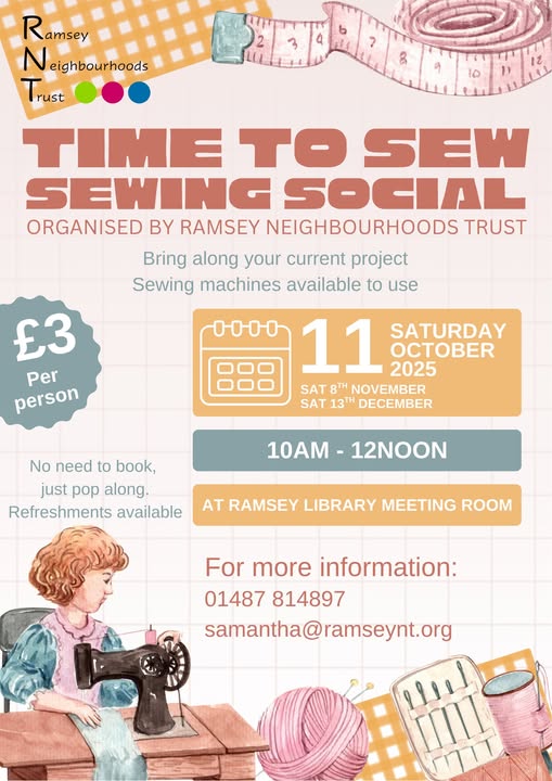 🧵✨ Happening Today – Time to Sew Sewing Social! ✨🧵 Looking for a cosy, creative way to spend your Saturday morning? Come join us at the Ramsey Library for our friendly sewing social! (fb)