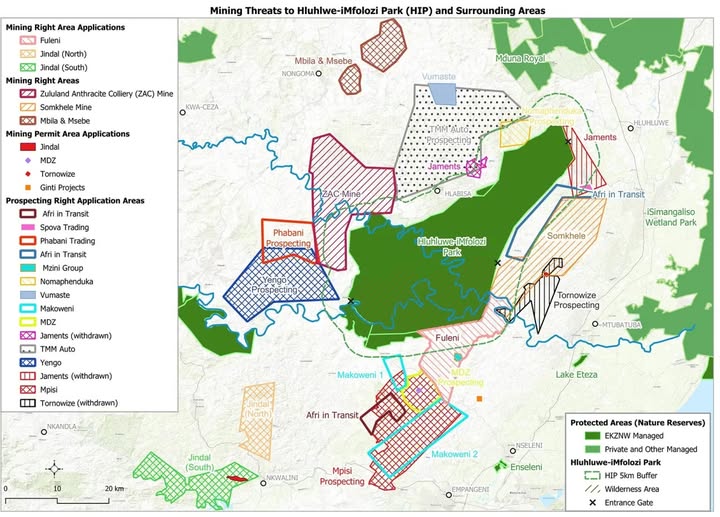 The race for mineral resources is tightening its grip on South Africa's oldest game reserve. The Hluhluwe-iMfolozi Game Reserve is now nearly encircled by prospecting and mining applications targeting coal and other minerals. Over a dozen companies have applied for mining rights along the park’s boundaries, threatening the integrity of the protected area and the wellbeing of surrounding communities. If approved, mining operations could bring daily dynamite blasts, pollution, and forced relocations to people living near the park’s edges. Please read more about it here: https://www.dailymaverick.co.za/article/2025-03-09-coal-hunters-circle-africas-first-wilderness-and-rhino-sanctuary/ #Conservation #WildlifeProtection #HluhluweiMfolozi #SouthAfrica (fb)