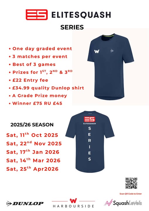Elitesquash Series is Back for 2025/26 Entry is now open for the Round 1 of The Series which will take place on Saturday, 11th of October, 2025 at Workout Harbourside, Floating Harbour, Welsh Back, Bristol, BS1 4SB. Enter here https://elitesquash.leaguemaster.co.uk/cgi-county/icounty.exe/showtournamentinfo?tgroupid=8 We have some exciting additions and changes to the series this season. Prizes We are offering prize money to the winner and runner-up in Grade A. The winner will received £75 and the runner-up will receive £45. We also have great prizes from our sponsor Dunlop for 1st, 2nd, and 3rd for each grade! • Rucksacks • 3 pack socks • 24 grips • tube balls • 2 wrist bands • bottles • hoodies T-Shirts The Trustees of Avon Squash & Racketball Association, of which both John and I are, announced at the AGM held in July that we wish to achieve a more sustainable and ethical approach to tournament, t-shirts and other gifts. With that in mind John and I have decided to no longer offer every player a T-shirt in each round of the series. To support the County's objectives we would encourage you, if you wish to have a shirt, to purchase a single one for the season the first time you enter one of the rounds. John has sourced a quality shirt from Dunlop that will be available in Navy or Red. You can see a mock up of the shirt in the attached poster and we are finalising the design before the first event. When you enter you will see payment options for Entry and for Entry + T-shirt. You will also be able to select your choice of size and colour. In order to be able to place the order in enough time, entries for shirts will close 10 days earlier. We can accept orders for shirts beyond that date but there will be no promise it will arrive on time. If you do want more than shirt please email John with what you need. He would send a separate link for the T-shirt to make payment. Streaming Following on from the installation of a camera from SquashTV, overlooking Court 2, will be able to stream all matches on Court 2. We will ensure that all Grades get a fair chance to have matches on this court. Final Round - Round 5 John and I have been playing around with ideas for this final round, such as bringing together the best performers in the previous rounds (ie winners, runners-up etc) to compete in the grades, or just leave it as before. If you have any ideas around this we would welcome you input. John Welton & Seamus Singh Redland Green Club Workoutbristol Harbourside Squash Club Workout Harbourside Lansdown Tennis, Squash & Croquet Club Kingsdown Squash Club Yate Squash Club Thornbury Squash Club BAWA Squash Club Weston Squash & Racketball Club UWE Squash Brand University of Bristol Squash Club University of Bath Squash Bradley Stoke Squash Club @followers (fb)