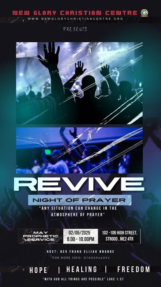 FINAL REMINDER – REVIVE: Night of Prayer Join us TONIGHT, 2nd May 2025, from 8:00 PM to 10:00 PM at New Glory Christian Centre Int'l Ministries, 102–106 High Street, Strood, ME2 4TR, for a powerful Night of Prayer under the theme: “Any situation can change in the atmosphere of prayer.” This May Prophetic Service will be hosted by New Glory Church. Come expecting hope, healing, and freedom—because with God, all things are possible (Luke 1:37). For more info: 07800966092 Website: www.newglorychristiancentre.org Don’t miss what God has in store for you—invite someone and come ready! 🔥 (fb)