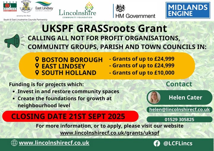 📢FUNDING ANNOUNCEMENT - UKSPF GRASSroots Grant Scheme 📢 Applications for the UKSPF GRASSroots Grant Scheme are NOW OPEN in: 📌Boston, East Lindsey and South Holland 💰 Funding of up to £24,999 available in Boston and East Lindsey, and £10,000 in South Holland 📅 Closing date: 11:59pm, Sunday 21st September 2025 ✅ Funding is for capital projects which o Strengthen the social fabric of communities o Build pride of place by investing in local facilities o Improve social connections ⚠️Priority will be given to organisations who have not yet received UKSPF funding through either GRASSroots or other UKSPF funded schemes. 📝 To apply and for further information of the criteria, please visit www.lincolnshirecf.co.uk/grants/ukspf/ 📩 If you have any queries, please contact Helen Cater 01529 305825 or email helen@lincolnshirecf.co.uk (fb)