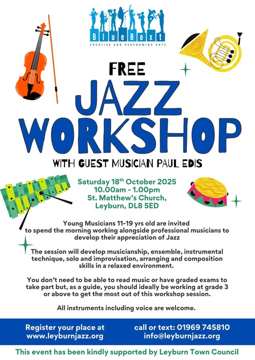 As a part of this years @LLeyburn Jazz Festival, we’re excited to welcome guest musician Paul Edis for a special Jazz Workshop on Saturday 18th October, 10.00am–1.00pm at St. Matthew’s Church, Leyburn. This free session will explore jazz standards, composition, and improvisation. It’s an ideal opportunity for young musicians working towards Grade 3 and above to develop their skills and try something new. Places are limited, so get in touch today to secure your spot. (fb)
