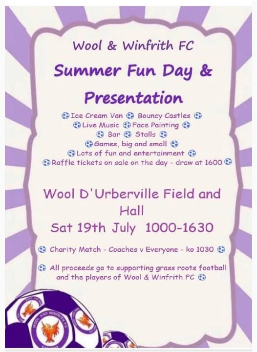 SAVE THE DATE Wool and Winfrith FC AGM meeting. *Tuesday 1st July @ Winfrith Newburgh Village Hall* 7pm 💜🥅⚽ (fb)