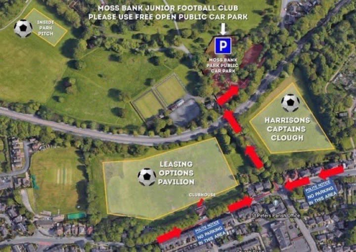 #MossBankJFC Please could all the teams playing on the Pavilion, Captains Clough, and Park Pitch in the @OfficialBBDFL please use the free public car park in Moss Bank park & walk to pitches as of map. We want to reduce parking in the residential area on Church Rd & we would be grateful for your cooperation ⚽️ Also please do not park on the pavement on Captains Clough Road has you are obstructing the general public! You will get booked by traffic wardens ⚽️ (fb)