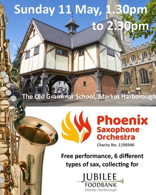 REMINDER! The Phoenix Saxophone Orchestra will be holding a free performance TODAY, Sunday 11 May at 1:30pm where they will be collecting for Jubilee Foodbank! 💜🎷 #marketharborough #harbs #harbslocal #foodbank #harborough #localfoodbank (fb)